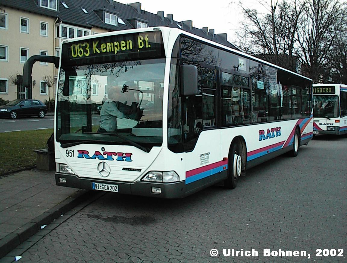 Dieses Foto entstand während eines "Gipfeltreffens" dreier Rath-Busfahrer in diesem Mercedes-Benz O 530 Citaro (EZ 2001), da sich zum Zeitpunkt der Aufnahme vom 30.01.2002 ungewöhnlicherweise drei Rath-Busse gleichzeitig am Kempener Bf. befanden. Die Linie 063 existiert erst seit Juni 2001 und führt von Kempen nach Wachtendonk.