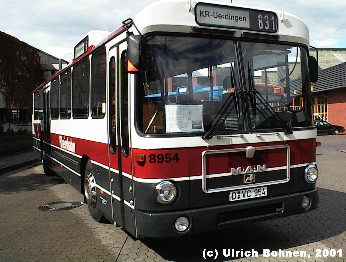 Hier ist ein MAN SÜ 240 des Baujahres 1983 zu sehen. Wagen 8954 ist mit einem Rollstuhllift an der hinteren Tür ausgestattet und wurde lt. der Rheinbahn-Internetseite als Behinderten bzw. Mehrzweckbus eingesetzt. Mittlerweile befindet sich dieses Fahrzeug nicht mehr im Rheinbahn-Fuhrpark.