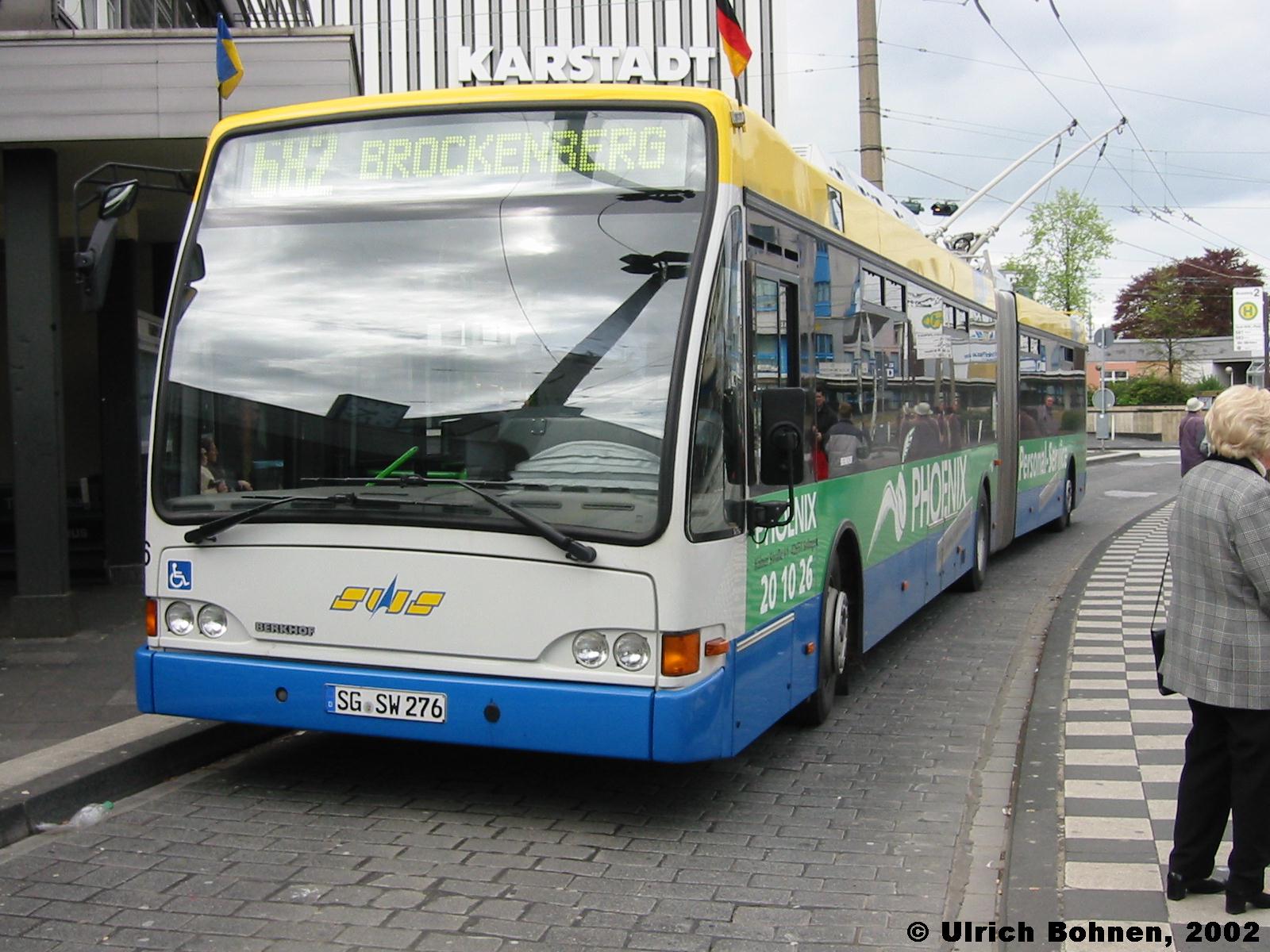 Auch auf der SWS-Linie 682 werden die neuen Berkhof AT 18 (Premier) eingesetzt, so wie auf diesem Bild am 01.05.2002 der Wagen 176 nach Brockenberg. In diesem Jahr sollen weitere Oberleitungs-Gelenkbusse nach Solingen geliefert werden, diesmal von der belgischen Firma Van Hool.