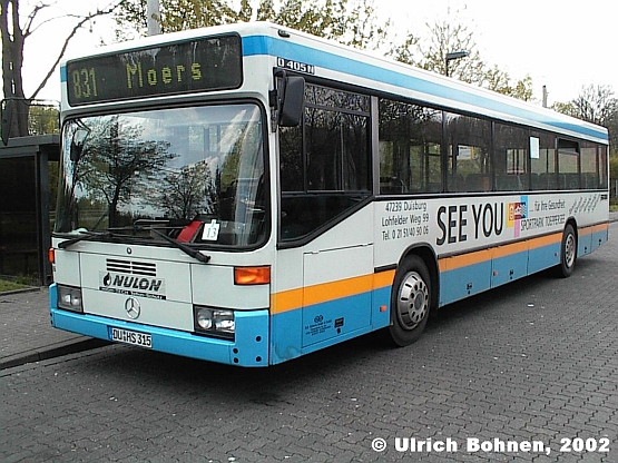 Dieser Mercedes-Benz O 405 N1 wurde am 20.04.2002 kurz vor Fahrtantritt als Linie 831 nach Moers in Meerbusch am Haus Meer abgelichtet. Der Bus gehört der Firma Schmitz aus Duisburg.