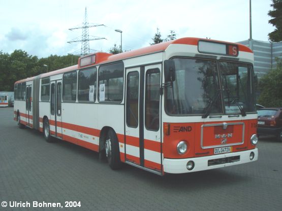 Am 04.07.2004 fand auf dem Bogestra-Betriebshof in Bochum-Weitmar ein Tag der offenen Tür statt. Es konnten einige interessante Busse abgelichtet werden, so auch dieser MAN SG 240 H aus dem Jahre 1982, der während der Veranstaltung zeitweise als Pendelwagen zwischen dem Bochumer Hbf. und dem Betriebshof im Einsatz war. Der Wagen fuhr bis 1997 in seinem ursprünglich braunen Lack bei den Dortmunder Stadtwerken als Wagen 1168. Nach einigen Jahren bei einem privaten Unternehmer gehört das weitgehend unrestaurierte Fahrzeug jetzt der "Arbeitsgemeinschaft Nahverkehr Dortmund e. V." (AND), die das Fahrzeug mit einer "aktualisierten" Dortmunder Lackierung einsetzt.