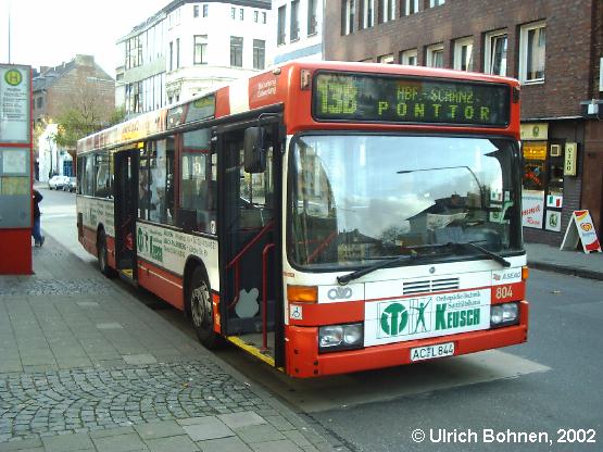 Die ASEAG (Aachener Straßenbahn- und Energieversorgungs-AG) betreibt mit ca. 250 Bussen den ÖPNV in Aachen. Eingesetzt werden auch Fahrzeuge von EvoBus-Mercedes, so wie dieser Vertreter des Typs O 405 N2, der 1995 in Dienst gestellt wurde. Ungewöhnlicherweise ist sogar die Front des ASEAG-Wagen 804 mit Werbung versehen; dafür musste der Mercedes-Stern weichen. Die Aufnahme entstand am 02.11.2002 am Ponttor in der Aachener Innenstadt.