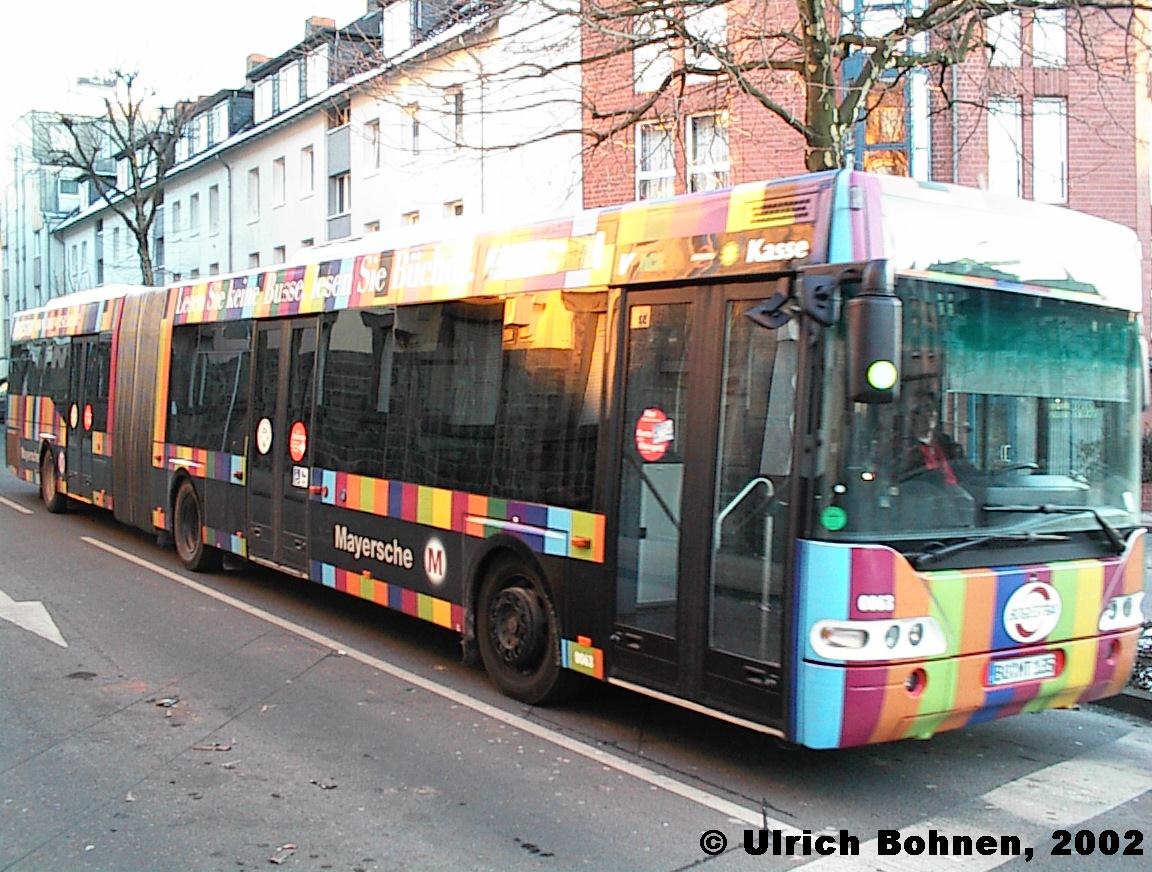 Dieser Neoplan N 4421 Centroliner mit der sehr auffälligen Reklame für eine Bücherei konnte am 05.01.2002 in der Innenstadt von Hattingen aufgenommen werden. Bei diesem Fahrzeug handelt es sich um den Wagen 0063 der Bochum-Gelsenkirchener Straßenbahnen AG (Bogestra) im Einsatz auf der CityExpress-Linie CE 31 nach Bochum.