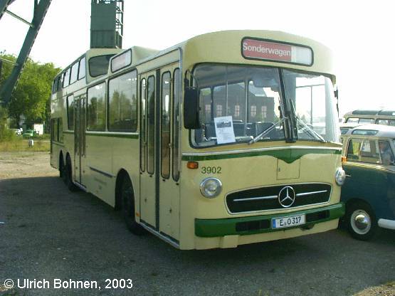 Der Bus, der am Rand abgestellt war, ist ein Mercedes-Benz O 317 1 1/2-Decker mit einem Aufbau der Firma Ludewig aus Essen. Der Bus wurde im Jahr 1974 von der damaligen Krefelder Verkehrs-AG (heute SWK Mobil GmbH) beschafft und verkehrte bis 1984 als Wagen 5555 im Linienverkehr. Danach gelangte er über verschiedene Stationen (inkl. "Dornröschenschlaf") zur EVAG in Essen, die ihn über Jahre hinweg aufwändig restaurierte und Mitte dieses Jahres als Wagen 3902 der Öffentlichkeit präsentierte. Eine nicht ganz zeitgenössische Sache: Das Fahrzeug ist - wie alle seit 1995 gebauten Busse - im Zuge der Restauration mit seitlichen Markierungsleuchten ausgestattet worden.