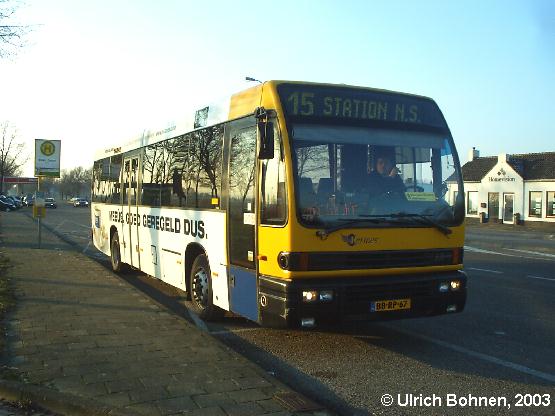 Dies ist das bereits versprochene Bild des niederländischen Busses, der von der deutsch-niederländischen Grenze bei Niederkrüchten-Elmpt aus als Linie 15 nach Roermond fährt. Das Foto entstand am späten Nachmittag des 11.01.2003 auf bereits niederländischem Gebiet. Besitzer dieses Den Oudsten B 91 mit dem Kennzeichen BB-RP-67 ist der Hermes-Konzern, der im süd-östlichen Teil unseres Nachbarlandes seine Fahrzeuge einsetzt. Den Oudsten ist leider vor kurzem in Konkurs gegangen - alle Rechte sind auf die Firma Techno Service Nederland übergegangen, so auch die Wartung und Ersatzteilversorgung.