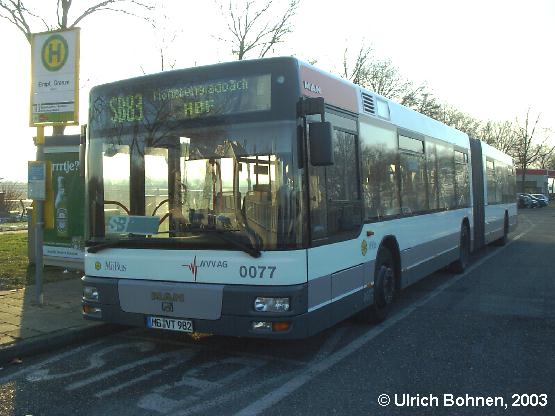 Am Nachmittag des 11.01.2003 entstand dieses Foto eines MAN NG 263 (Baujahr 2000) der NVV AG aus Mönchengladbach an der Haltestelle Elmpt, Grenze. Der Wagen mit der Nr. 0077 wird - wie sein "Zwillingsbruder" 0078 - ausschließlich auf der SchnellBus-Linie SB83 zwischen dem Mönchengladbacher Hauptbahnhof und dem deutsch-niederländischen Grenzübergang bei Niederkrüchten-Elmpt im Kreis Viersen eingesetzt, u. a. auch auf zwei Autobahnen. Von dieser Haltestelle aus besteht die Möglichkeit, weiter in die niederländische Stadt Roermond zu fahren.