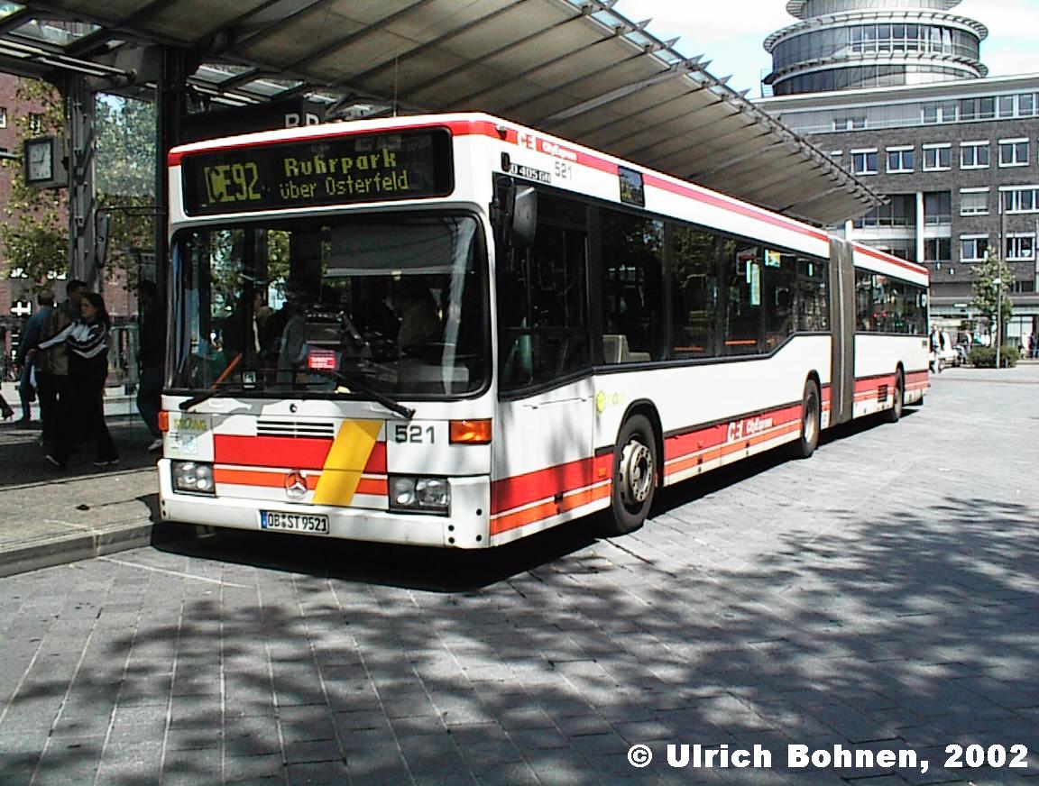 Die Stadtwerke Oberhausen AG (STOAG) besitzen Busse der Marken Mercedes-Benz und MAN. Wagen 521, ein Mercedes-Benz O 405 GN2 des Baujahres 1996, konnte am 28.06.2002 am Oberhausener Hauptbahnhof im Einsatz auf der CityExpress-Linie CE 92 aufgenommen werden. Weitere Busfotos aus Oberhausen finden Sie in der Rubrik Busfotos.