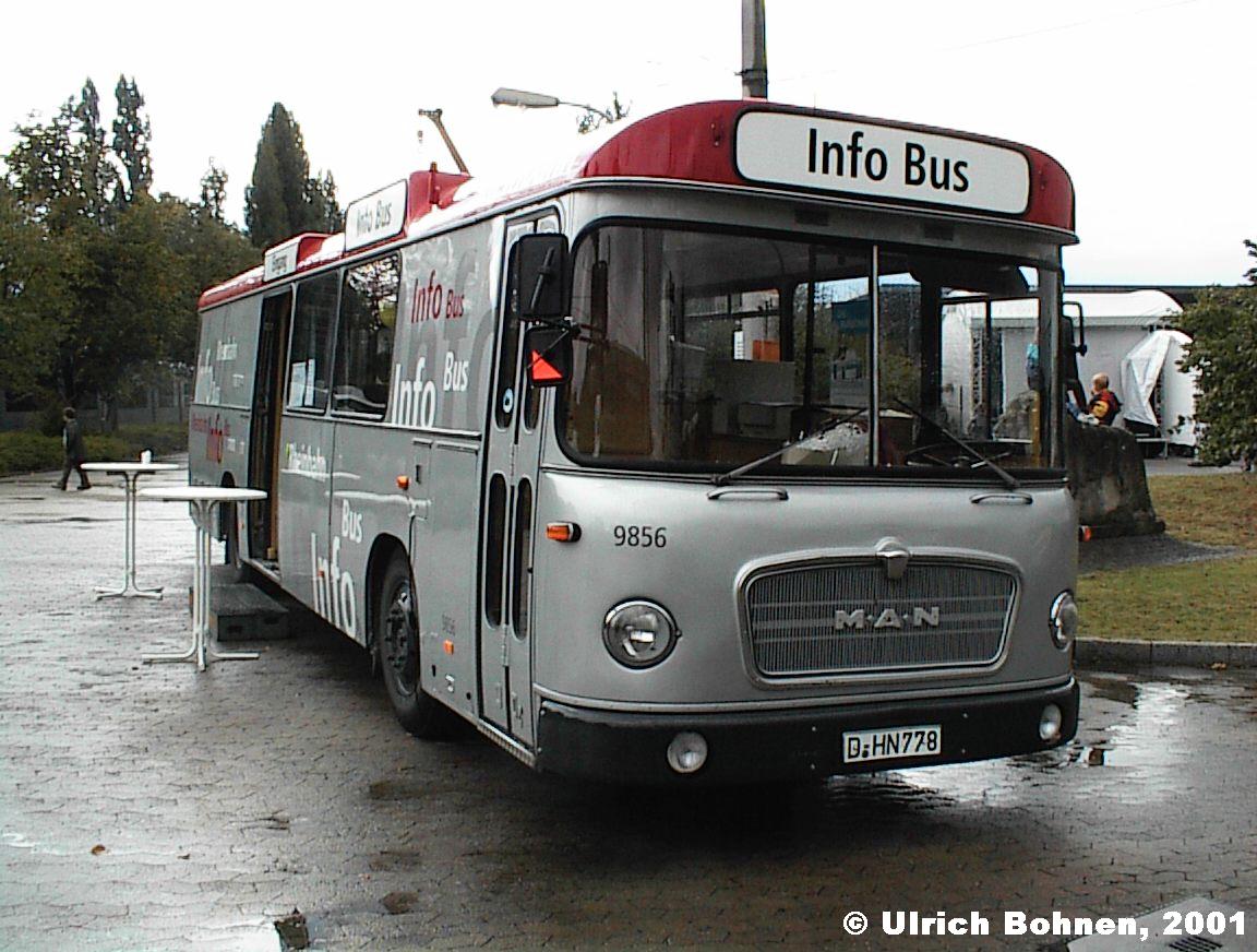 Das Bild zeigt einen MAN 750 HO-M 11 A (Baujahr 1969) der Rheinbahn aus Düsseldorf. Das mittlerweile zum "Info-Bus" umgebaute Fahrzeug mit der Wagen-Nr. 9856 konnte am 16.09.2001 anlässlich des Tages der offenen Tür auf dem Rheinbahn-Betriebshof in Düsseldorf-Heerdt aufgenommen werden.