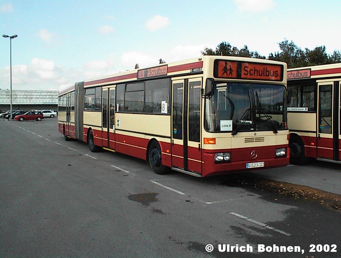 Rath-Reisen aus Viersen-Süchteln ist seit ein paar Jahren ein treuer Abnehmer von ausgemusterten Fahrzeugen der NVV AG (MöBus) aus Mönchengladbach. Die übernommenen Fahrzeuge werden jedoch nicht weiter im Linienverkehr eingesetzt, sondern ausschließlich im Schülertransport verwendet. Im Sommer 2002 wechselte der Ex-NVV-Wagen 8865 des Baujahres 1988 den Besitzer. Wie gewohnt wurden die bis zur Ausmusterung blau lackierten Karosserieteile in dunkelrot umgespritzt. Die Aufnahme des Busses entstand am 23.09.2002 auf einem Supermarkt-Parkplatz in Tönisvorst-St. Tönis (bei Krefeld).