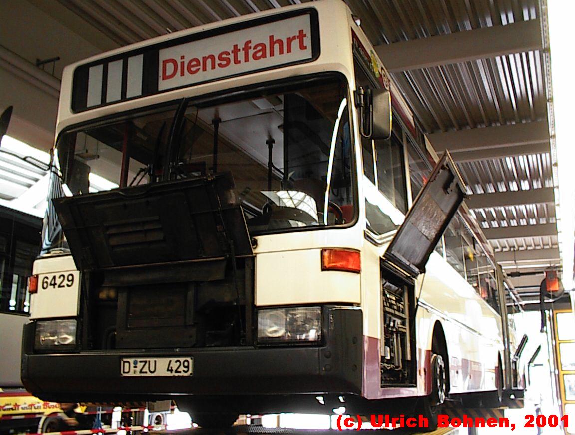 Bei diesem "schwebenden" Mercedes-Benz O 405 G der Rheinbahn aus Düsseldorf hat man den Begriff "Tag der offenen Tür" wohl etwas zu wörtlich genommen. Eben zu diesem Anlass konnte der Bus am 16.09.2001 im Betriebshof Düsseldorf-Heerdt aufgenommen werden.