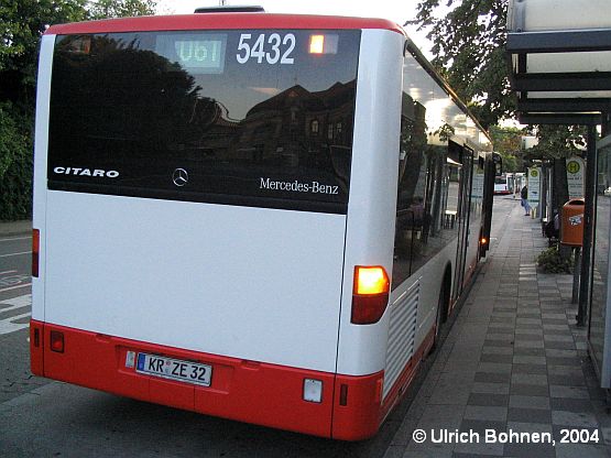 Nagelneu im Fuhrpark der SWK Mobil GmbH aus Krefeld sind acht EvoBus-Mercedes O 530 Citaro, die (mutmaßlich) mit den Wagennummern 5430-5437 in Dienst gestellt worden sind. Am Abend des 08.09.2004 konnte der Wagen 5432 am Krefelder Hauptbahnhof aufgenommen werden. Die Fläche über den Seitenscheiben ist mit weißer Folie beklebt worden.