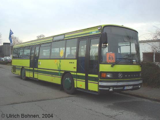 Die Firma Hegger aus Krefeld war bis zu ihrer Insolvenz im Jahre 2003 u. a. Subunternehmer der SWK Mobil GmbH aus Krefeld. Nach der Pleite wurden fast alle Busse - überwiegend mit einer auffälligen Lackierung und aufgeklebten Blumen auf der Seite versehen - an Unternehmen in der Region verkauft, so auch dieser Kässbohrer-Setra S 215 SL von 1990, der sich bis auf den fehlenden Hegger-Schriftzug und neuen blauen Sitzpolstern noch im Original-Zustand befindet. Mittlerweile gehört das Fahrzeug der Firma VZ-Reisen ("Der Schwafheimer") aus Moers (Kennzeichen: WES-VZ 28). Die Aufnahme entstand am trüben Winternachmittag des 10.01.2004 in einem Krefelder Gewerbegebiet.