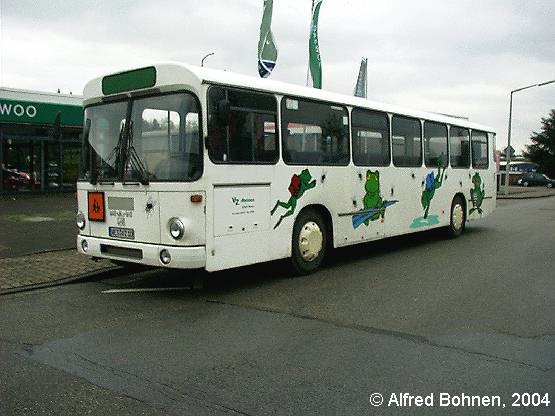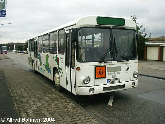 Die Firma VZ-Reisen ("Der Schwafheimer") aus Moers besitzt u. a. diesen MAN SÜ 240, der mit recht auffälligen Abbildungen von Fröschen und Fliegen auf beiden Seiten versehen ist und im Schulbusverkehr eingesetzt wird. Weitere Daten dieses Busses mit dem Kennzeichen WES-VZ 10 sind leider nicht bekannt. Das Foto entstand am 11.02.2004 in einem Moerser Gewerbegebiet. Diese Aufnahmen wurden von Alfred Bohnen zur Verfügung gestellt!