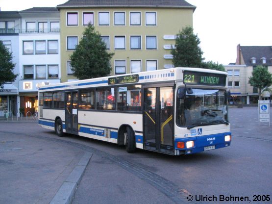 Am 20.07.2005 konnte abends in Düren an der zentralen Haltestelle Kaiserplatz dieser MAN NL 202 der 1. Generation abgelichtet werden. Früher befand sich das Fahrzeug im Besitz der Dürener Kreisbahn (DKB) und war ein Einzelstück; mittlerweile wird der Bus von der Firma Lövenich-Reisen aus Niederzier im Auftrag der DKB eingesetzt.