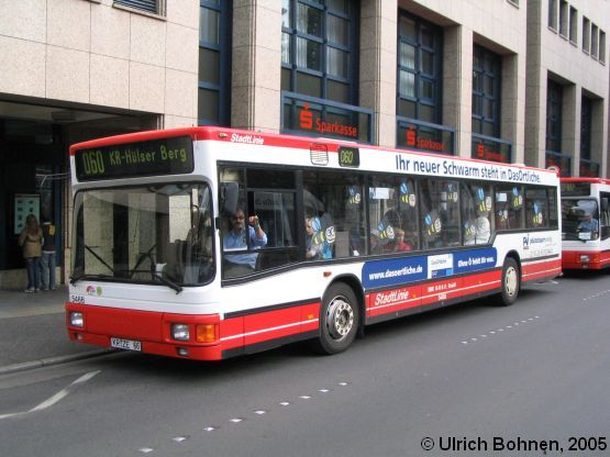Dieses Bild zeigt einen der zahlreichen MAN NL 202 der SWK Mobil aus Krefeld. Wagen 5466, der 1993 beschafft wurde, hält am 25.09.2005 gerade an der zentralen Haltestelle Ostwall in Krefeld.