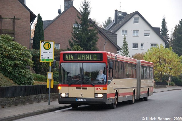 Am Nachmittag des 29.10.2009 erreicht der west-Wagen 9522, ein 1995 gebauter EvoBus-Mercedes O 405 G in klassischer Farbgebung, die Endhaltestelle Wanlo Kreuz, die sich im Süden von Mönchengladbach befindet.