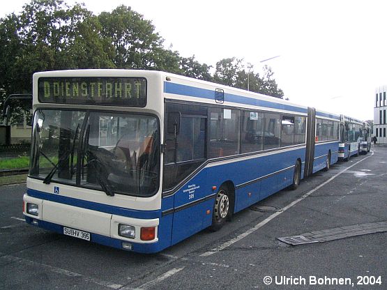 Recht selten sind MAN-Niederflurbusse der 1. Generation mit den hohen Seitenscheiben ohne den charakteristischen "Knick". Die RSVG setzt einige Exemplare des Typs A 11 ein, so wie etwa den hier gezeigten Wagen 395.