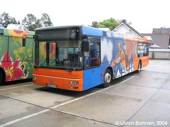 Ein weiterer MAN A 21 mit einer VR-Bank-Vollwerbung ist Wagen 496, der nachträglich mit einer etwas "unförmigen" Klimaanlage ausgerüstet wurde (genauso wie der "Blumen-Bus" nebenan).
