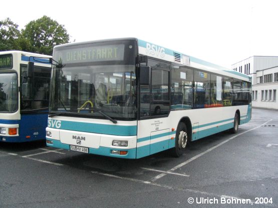Diese Aufnahme zeigt wiederum einen MAN A 21. Wagen 498 - genauso wie alle anderen RSVG-Busse - wirbt mit einem großen Plakat auf der Seitenscheibe am Kinderwagen-/Rollstuhlplatz für den Tag der offenen Tür beim Verkehrsbetrieb.