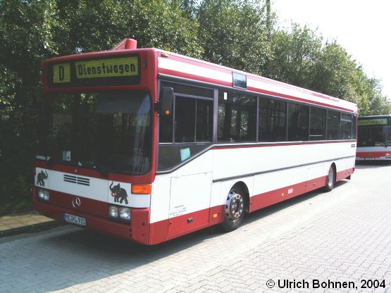 Außerdem konnte dieser Mercedes-Benz O 405 abgelichtet werden, welcher ebenfalls aus dem Jahre 1988 stammt und vorher bei der Duisburger Verkehrs-AG als Wagen 868 seine Runden drehte. Vor kurzem wurde der Bus mit Matrixanzeigen sowie mit zwei Jumbos, dem Symbol von Klingenfuß, an der Front ausgestattet. Man beachte besonders den Elefanten unter dem Fahrerplatz, der ziemlich "rücksichtslos" über die alte DVG-Wagennummer geklebt wurde.