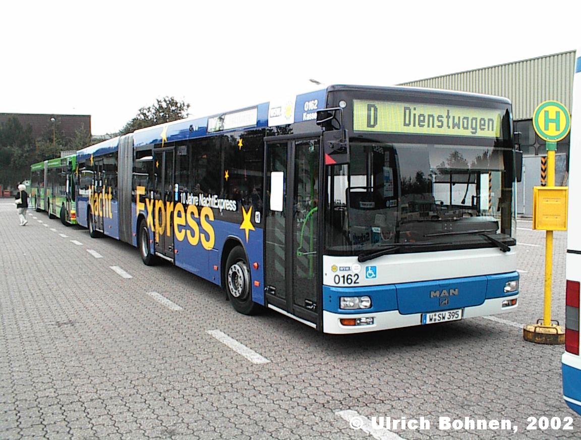 Während des Tages der offenen Tür hatte Wagen 0162, ein MAN NG 313, eine "absperrende" Funktion als Schutzwall, da vom Aufnahmepunkt gesehen rechts jedermann einmal einen Bus fahren durfte. Das Fahrzeug wirbt für den Nacht-Express der Wuppertaler Stadtwerke mit dem eigenartigen Motto "Alles schläft - einer fährt!".