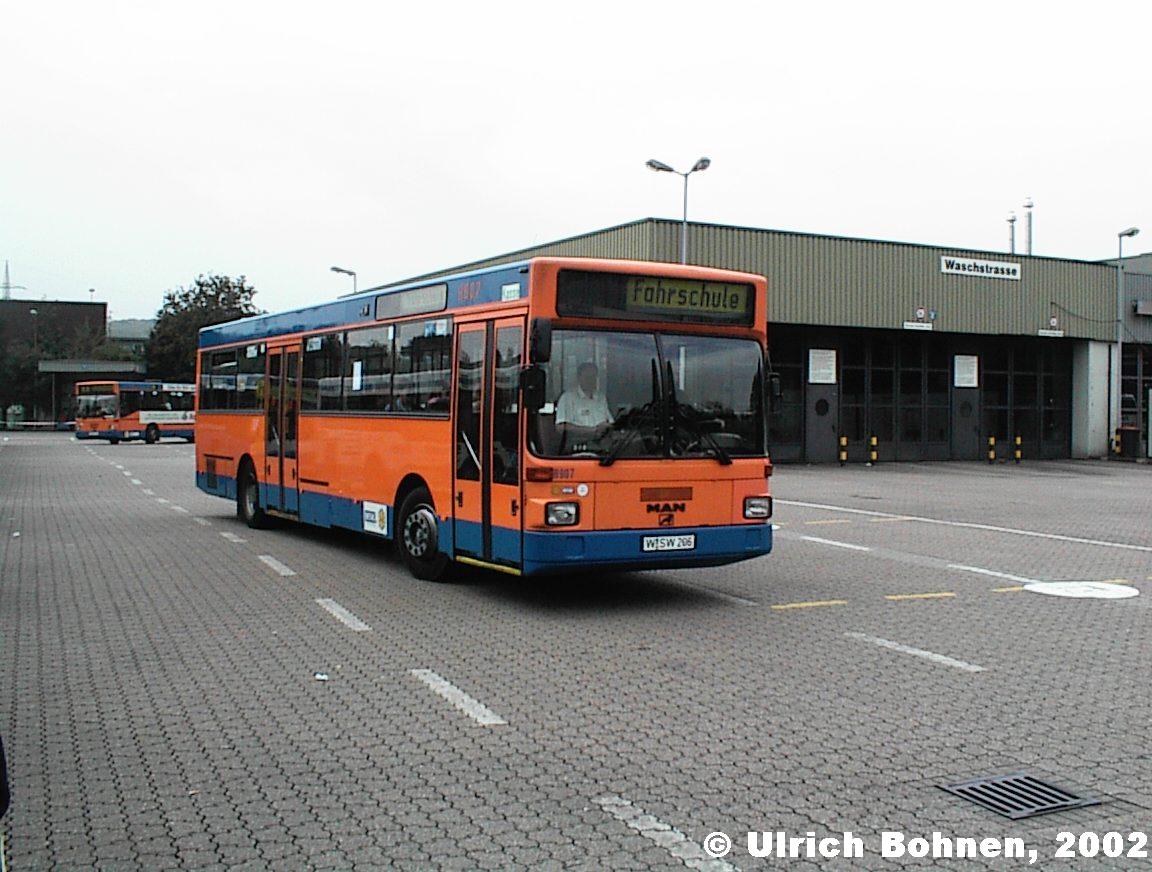 Hier nun einer der schon angesprochenen Fahrschulbusse, die während der Tages der offenen Tür jedermann zur Verfügung standen. Wagen 8907 des Baujahres 1989, ein MAN SL 202, trägt noch die "traditionelle" orange-blaue WSW-Lackierung. Im Hintergrund kommt gerade der zweite Fahrschulbus um die Ecke gefahren (s. nächstes Bild).