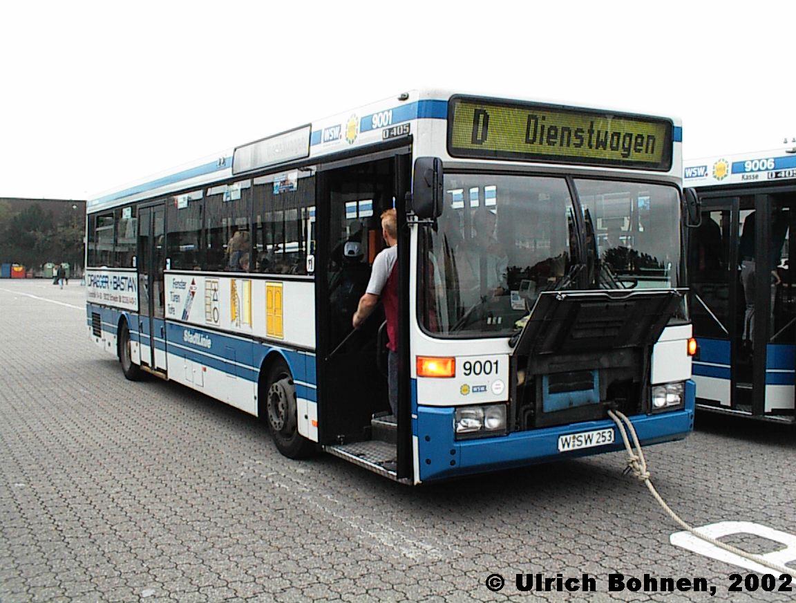 Entgegen dem ersten Eindruck hatte dieser Mercedes-Benz O 405 der WSW (Wagen 9001) zum Zeitpunkt der Aufnahme keine Panne. Trotzdem wurde das Fahrzeug von mehreren Personen am sichtbaren Seil "abgeschleppt". Leider musste immer wieder beobachtet werden, wie ziehende Kinder stürzten und der Bus-"Fahrer" deswegen scharf abbremsen musste.