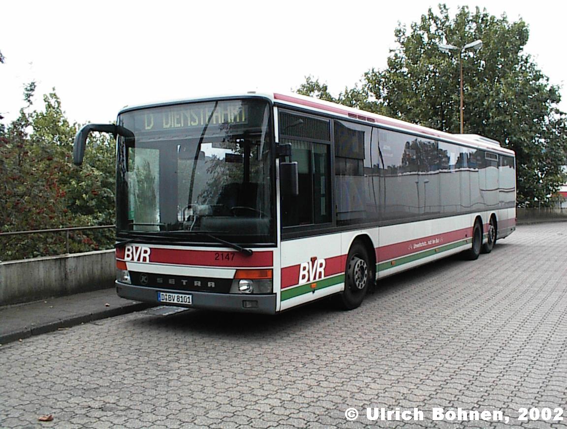 Obwohl schon seit ein paar Jahren zu kaufen, gehören 15-m-Busse immer noch zum seltenen Bild auf den Straßen. Ein solcher, sehr früher, Vertreter ist der BVR-Wagen 2147, ein Setra S 319 NF aus dem Jahre 1998, der mit einer Klimaanlage ausgestattet ist.