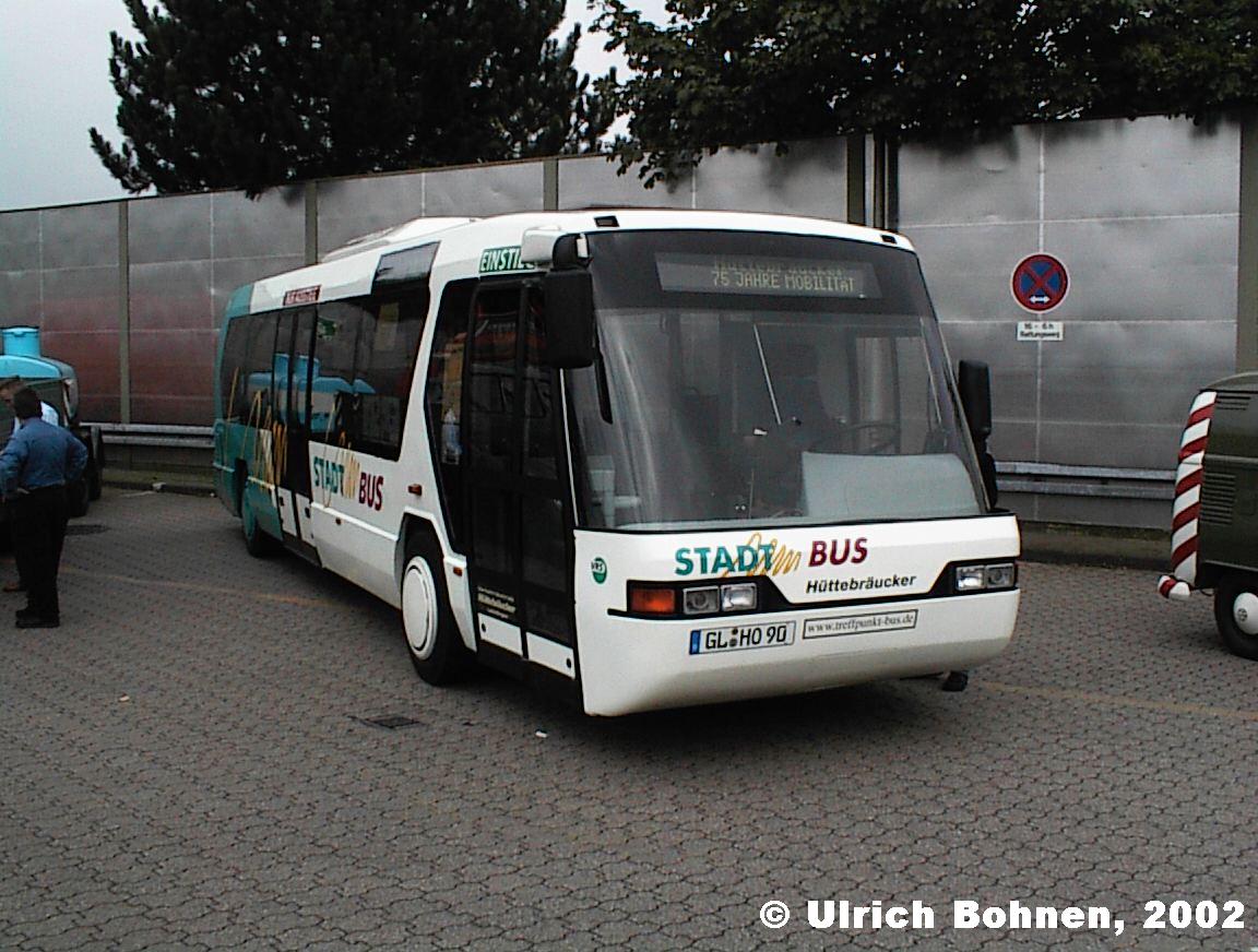 Dieser vom Design her außergewöhnliche Bus gehört der Firma Hüttebräucker aus Leichlingen. Es handelt sich hierbei um einen Neoplan Metroliner MIC 8012 (MIC = Metroliner Im Carbondesign). Das Fahrzeug mit dem Kennzeichen GL-HO 90 wird innerhalb des Stadtbus-Systems der Stadt Leichlingen eingesetzt.