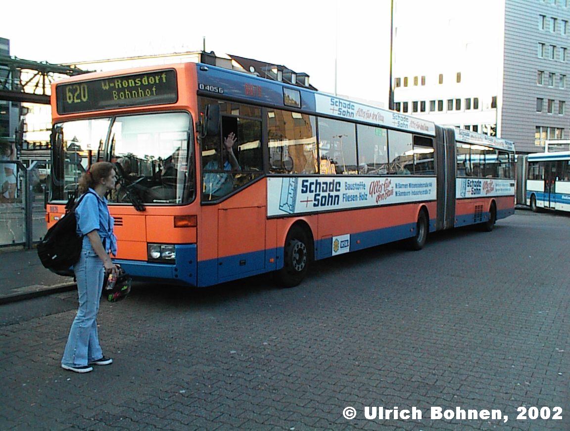 Zuerst dachte ich: "Sch...., genau die Frau vor dem Bus!". Aber aufgrund des freundlichen Grußes des Busfahrers wird die Aufnahme eines Mercedes-Benz O 405 G, Wagen 8876 aus dem Jahr 1988, doch noch bei NRW-Bus.de veröffentlicht. Es ist damit zu rechnen, dass mehrere Fahrzeuge der Baujahre 1987 und 1988 ausgemustert werden, wenn demnächst die neuen Mercedes- und MAN-Busse bei der WSW eintreffen.