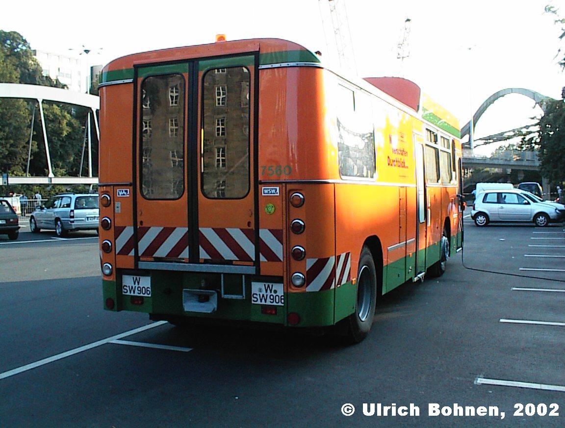 Hier eine Heckaufnahme des WSW-Pannenfahrzeuges (siehe auch vorheriges Bild). Deutlich zu sehen ist die neu geschaffene Einstiegsmöglichkeit im Heck des ehemaligen Gelenkbusses. Interessanterweise befindet sich an der Hecktür wie bei einem normalen Linienbus ein Türbetätigungsknopf (hellgrün, rechts neben der Tür).
