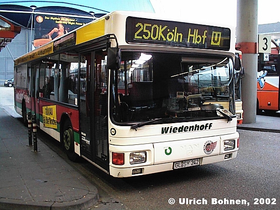 Das Bild zeigt einen MAN NL 222 von Wiedenhoff aus Leichlingen und konnte am Busbahnhof des Kölner Hbf. gemacht werden. Wagen 242 hat als Linie 250 aus Solingen kommend seine Endstation erreicht. "Kraftverkehr Gebrüder Wiedenhoff" ist ein alteingesessenes Busunternehmen und existiert bereits seit 1924.