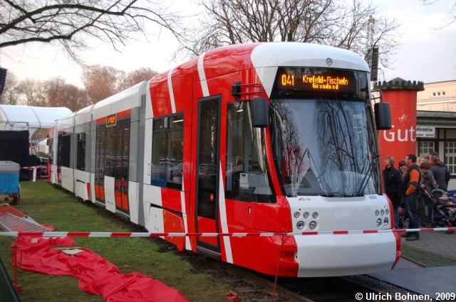 Das Jahr 2009 wird in die Krefelder Straßenbahn-Geschichte eingehen, denn Ende 2009 werden das erste Mal seit 28 Jahren neue Straßenbahnen in Dienst gestellt! Nachdem die Krefelder Bürger 2007 im Rahmen eines offenen Tages auf dem SWK-Betriebshof anhand drei ausgestellter Fahrzeuge unterschiedlicher Hersteller ihren Favoriten wählen konnten (und damals schon Bombardier die größte Zustimmung bekam), hatte auch die europaweite Ausschreibung der SWK Mobil GmbH dieses Ergebnis. Die Bahnen des kanadischen Bombardier-Konzerns werden komplett in NRW gebaut. Die Achsen werden in Siegen gebaut; Vossloh-Kiepe liefert aus Düsseldorf die Elektronik; der Zusammenbau erfolgt in den ehemaligen Talbot-Werken in Aachen. Von dort aus haben bisher (Stand Ende November 2009) zwei Fahrzeuge den Weg in die Samt- und Seidenstadt gefunden und erhielten bereits die Wagennummern 601 und 602, da die neuen Bahnen mit sechs Achsen ausgestattet sind. Seit seiner Ankunft in Krefeld am 16.09.2009 werden mit dem zukünftigen Wagen 601 umfangreiche Fahrversuche ("dynamische Inbetriebnahme") auch im Krefelder Schienennetz durchgeführt. Die offizielle Vorstellung und Enthüllung der neuen Bahn fand am 08.11.2009 im Rahmen mehrerer Pferderennen auf der Krefelder Pferderennbahn statt. Dort wurde zu diesem Anlass extra ein Gleis verlegt und die Bahn per LKW in den Stadtwald transportiert. Die ersten Fahrgastfahrten fanden nach der offiziellen Jungfernfahrt vom 12.12.2009 am 21.12.2009 statt. Bis August 2010 wird die Auslieferung der 19 Neufahrzeuge beendet sein. Es besteht eine Option auf 19 weitere Fahrzeuge, die dann in ein paar Jahren auch die Bahnen des Typs Duewag M8C ersetzen könnten. Ersetzt werden die verbliebenen Duewag GT8 der Baujahre 1964 bis 1976. |