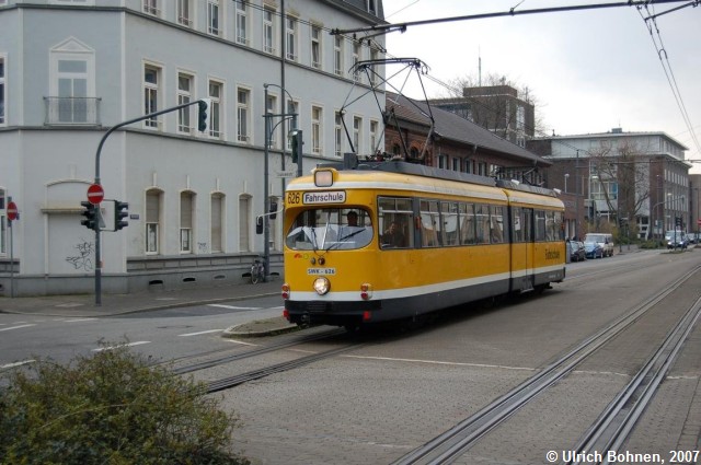Der SWK-Wagen 626 stellt eine Besonderheit im SWK-Fuhrpark dar. Es handelt sich um ein Fahrzeug, das zur Fahrerausbildung genutzt wird. Dafür wurde diese Bahn im Jahre 1984 aus zwei Vorderteilen von früheren Duewag GT6 zusammengesetzt. Seit dem Bau konnte man nun auch die Strecken mit Stumpfende (also ohne Gleiswendefläche) befahren, da es bei diesem Fahrzeug nun Führerstände in beiden Richtungen gibt. Über ein Schaltpult kann das Fahrlehrerpersonal diverse (Not-)Situationen simulieren, auf die dann die Fahrschüler/innen entsprechend reagieren müssen. |