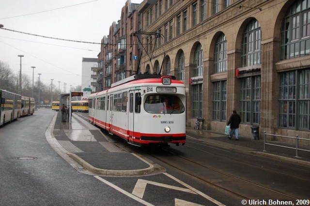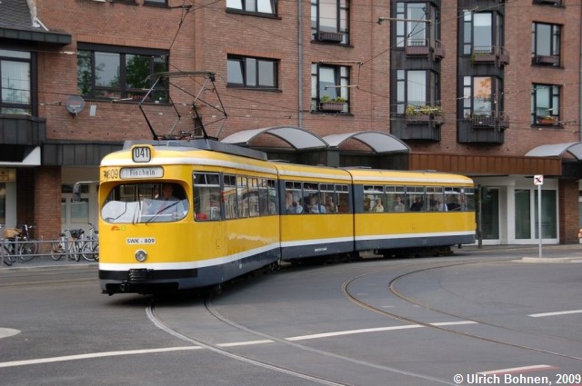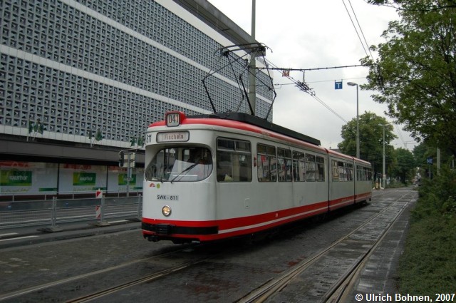 Der Duewag GT8 ist derzeit noch einer der beiden Fahrzeugtypen, die typisch für das Krefelder Straßenbahnnetz sind (der derzeitige Bestand beläuft sich auf 19 Wagen). "Duewag" ist die Abkürzung für "Düsseldorfer Waggonfabrik AG" - heute existiert das Unternehmen nicht mehr. Weitere allgemeine Informationen zur Firma Duewag gibt es bei Wikipedia. Die in Krefeld verkehrenden Fahrzeuge dieses Typs wurden in den 1970er Jahren durch den Einbau eines türlosen Mittelteils verlängert und verwandelten sich daher von GT6 zu GT8. Die Zahl in der Typenbezeichnung gibt die Anzahl der Achsen an. Lediglich die zuletzt beschafften Fahrzeuge wurden 1976 direkt als achtachsige Fahrzeuge in den Fuhrpark eingegliedert. Die beiden ältesten Fahrzeuge, die momentan noch verkehren, sind im Jahre 2009 (bis auf das Mittelteil) bereits 45 Jahre alt und gehören daher zu den ältesten Straßenbahnen, die in Deutschland noch im regulären Linieneinsatz verkehren! Im Zuge von Modernisierungen wurden die Bahnen, die bis in die 1990er Jahre hinein noch in elfenbein-dunkelrot lackiert waren, in rot-weiß umlackiert. Die in den 80er Jahren in gelb-weiß-anthrazit umlackierten Fahrzeuge verkehren heute noch größtenteils in dieser Farbgebung. Vor einigen Jahren wurden die Fahrzeuge mit Haltewunschtastern und "Wagen hält"-Anzeigen ausgestattet, so dass nicht mehr nur an drei von vier Türen der Aussteigewunsch signalisiert werden konnte. Im Laufe der Jahrzehnte schieden einige Bahnen unfallbedingt aus; dies erklärt die Lücken in der nachfolgenden Aufstellung (die Wagen 813, 820 und 827 existieren in Krefeld nicht mehr). Voraussichtlich bis Ende 2010 werden die sehr zuverlässigen jedoch nicht mehr zeitgemäßen Straßenbahnen ausgemustert und durch Neufahrzeuge des Typs Flexity Outlook Cityrunner von Bombardier ersetzt. |
