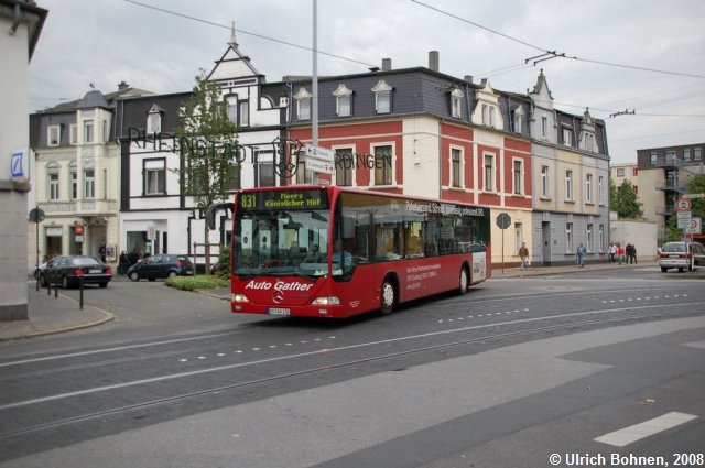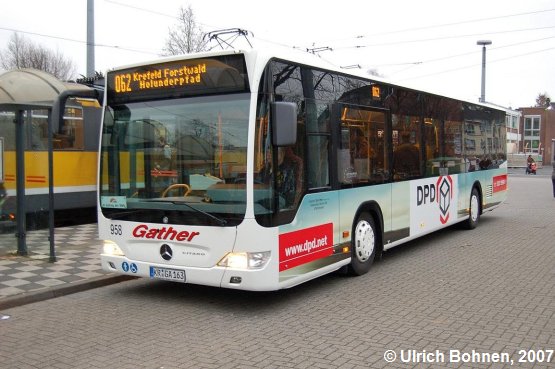 Das Krefelder Busunternehmen Gather ist nicht nur im Auftrag der SWK Mobil GmbH, sondern auch für die Düsseldorfer Rheinbahn unterwegs. Auf deren Linie 831 kommt Gather auch in den Krefelder Stadtteil Uerdingen. In der Nähe der Haltestelle "Am Röttgen", einem Umsteigepunkt zwischen Omnibus und Straßenbahn, konnte der EvoBus-Mercedes Citaro mit dem Kennzeichen KR-GA 150 vor relativ alter Häuserkulisse am 16.09.2008 fotografiert werden.