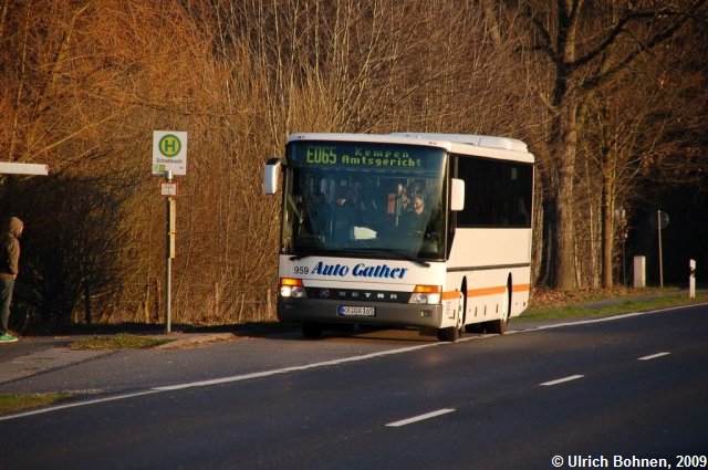 Im März 2009 wurden drei Omnibusse für den SWK-Auftragsverkehr aufgerüstet. Neben zwei neuen EvoBus-Mercedes-Citaro von Rath aus Viersen handelt es sich bei dem dritten Fahrzeug um diesen EvoBus-Setra S 315 UL, den Gather aus Krefeld in Dienst gestellt hat. Das Foto entstand am 20.03.2009 in Kempen-Schadbruch. Es handelt sich um das erste neu hinzugekommene hochflurige SWK-Auftragsfahrzeug seit langem - weitere Infos im Krefeld-Special!