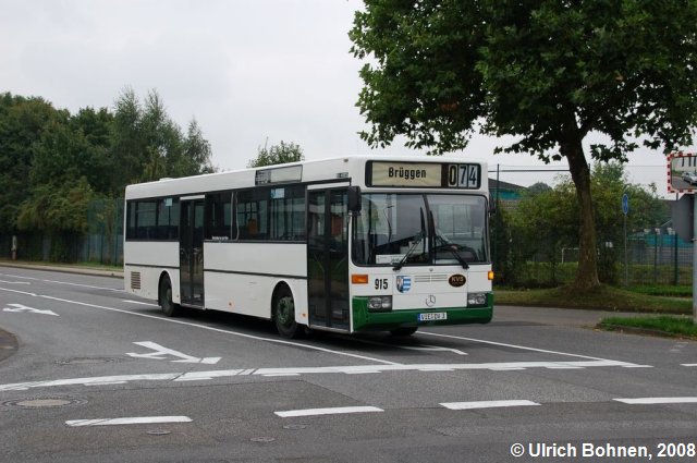 Mit Stand Ende August 2009 steht der Mercedes-Benz O 405 N von Lennartz aus Mönchengladbach mit dem Kennzeichen MG-HM 910 und der entsprechenden SWK-Funknummer 910 kurz vor der Ausmusterung. Das Nachfolgefahrzeug (mehr dazu in den Nachrichten) wird voraussichtlich Anfang September in Dienst gestellt. Am Nachmittag des 14.08.2009 war das 1990 gebaute Fahrzeug auf einer seiner Stammlinien, der SWK-Linie 055, zwischen Willich und dem Ortsteil Dickerheide unterwegs.