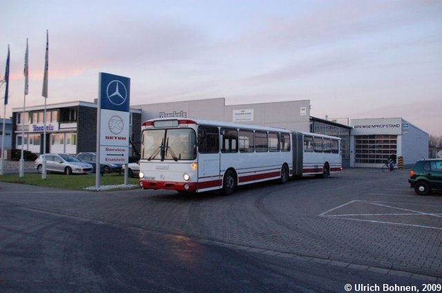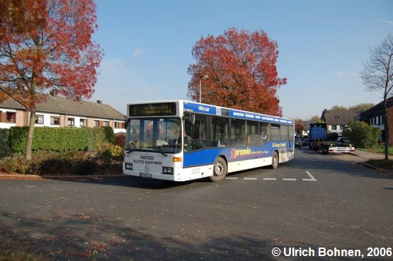Die Auto Gather GmbH & Co. KG aus Krefeld bedient mit zwei nur 10 Meter langen EvoBus-Mercedes O 405 NK im Wechsel die von der SWK Mobil GmbH betriebene Ringbuslinie 045 im Krefelder Ortsteil Hüls. Für den täglichen Umlauf auf dieser Linie reicht ein Bus aus. Die Hauptaufgaben der Linie sind die ÖPNV-Anbindung z. B. des Hülser Krankenhauses und die Zubringerfunktion zur Straßenbahnlinie 044 in Richtung Krefeld-Rheinhafen. Am späten Nachmittag des 08.11.2005 präsentiert sich der seit Januar 1998 eingesetzte Bus mit dem Kennzeichen KR-AG 127 dem Fotografen an der gleichzeitigen Anfangs- und Endhaltestelle Steeger Dyk in Krefeld-Hüls.