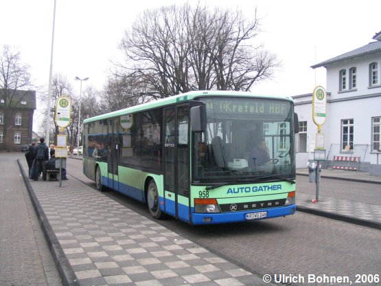 Die nicht mehr existente Firma Hegger beschaffte im Dezember 1996 diesen EvoBus-Setra S 315 NF und reihte ihn mit dem Kennzeichen KR-CB 800 in ihren Fuhrpark ein. Nach der Hegger-Insolvenz Mitte 2003 ging das Fahrzeug zum Nutzfahrzeughändler Boeckels aus Willich und wurde kurz darauf von der Firma Gather aus Krefeld übernommen. Dort erhielt der Bus die Zulassung KR-WG 146 und ist seitdem wie schon zu Hegger-Zeiten im Auftrag der SWK Mobil GmbH unterwegs. Das Bild entstand am trüben 04.02.2006 am Kempener Bahnhof, kurz bevor sich das Fahrzeug (übrigens noch in seiner auffälligen Original-Lackierung) als Linie 069 nach Krefeld in Bewegung setzte.