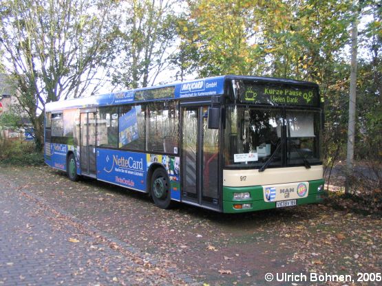 Dieser MAN A 21 (NL 223) des SWK-Subunternehmers Kraftverkehr Schwalmtal aus dem gleichnamigen Ort wurde mit einer neuen Vollreklame für die "Nette Card" (einer Art Vorteilskarte, die im Nettetaler Einzelhandel einsetzbar ist) versehen. Der Bus des Baujahres 2000 mit dem Kennzeichen VIE-BV 109 wird sich in Kürze auf den Weg als SWK-Linie 074 nach Viersen-Süchteln machen und konnte am 06.11.2005 während einer Pause in Nettetal-Kaldenkirchen am Schwimmbad abgelichtet werden.