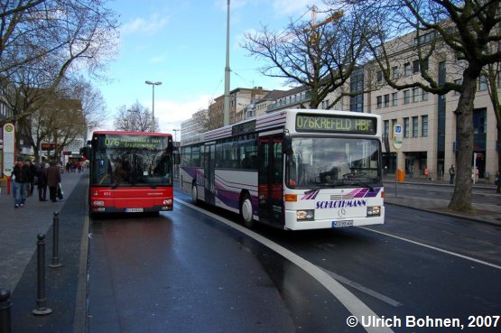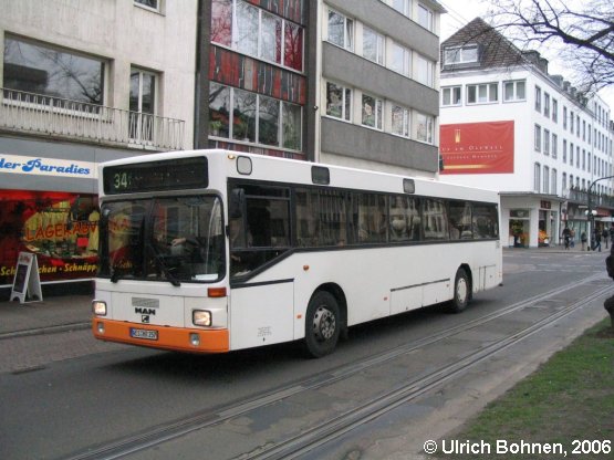 Seit einiger Zeit wird vom RVN-Subunternehmer Ringeisen aus Rheinberg im Wechsel mit dem bereits mehrfach im Krefeld-Special gezeigten Neoplan N 4416 Centroliner mit seiner aufwendigen Engadin-Gestaltung dieser MAN SL 202 mit dem Kennzeichen WES-HR 257 eingesetzt. Das 1991 gebaute Fahrzeug fuhr vorher bei bereits drei Betrieben: DBL Ostseetrans-Verkehrs-GmbH/Rostock, Nahverkehr/Stralsund und der KVG/Braunschweig. Am 11.04.2006 konnte der Bus mit einer inkorrekten Matrix-Anzeige auf dem Krefelder Ostwall in Höhe der Haltestelle Dreikönigenstraße in Richtung Hauptbahnhof fotografiert werden. Normalerweise würde auf der Zielanzeige in diesem Fall "079 Krefeld" stehen.