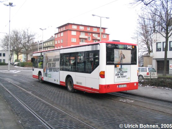 Ab Januar 2006 wird ein neues Tages-Ticket für eine Person im Verkehrsverbund Rhein-Ruhr (VRR) eingeführt. Zu diesem Zweck werben derzeit ca. 140 Fahrzeuge im VRR-Bereich für die Neuerung. In Krefeld wurden bisher drei EvoBus-Mercedes O 530 Citaro gesichtet, die neben dem Traffic-Board auf der linken Seite auch ein Heckposter tragen. Wagen 5442 präsentiert sich am Nachmittag des 30.12.2005 auf dem Krefelder Ostwall an der Haltestelle Nordwall. Aufnahmen der beiden anderen SWK-Busse mit der identischen Werbung (5441 + 5443) können im Krefeld-Special abgerufen werden.