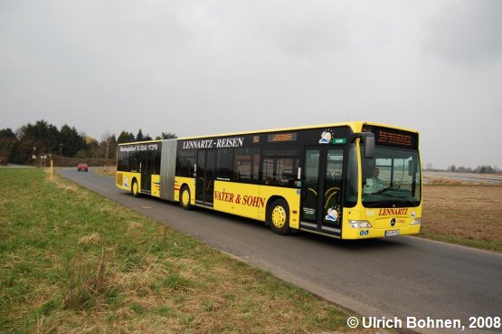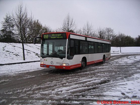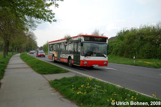Am 29.02.2008 gelang es endlich, den neuen EvoBus-Mercedes Citaro G von Lennartz aus Mönchengladbach im Bild festzuhalten: Der farbenfroh gestaltete Bus mit der SWK-Funknummer 956 und dem passenden Kennzeichen MG-HM 956 wird in Kürze Willich-Knickelsdorf und die dortige Endstation der Linie 055 erreichen, bevor er als mittäglicher E-Wagen nach Willich-Münchheide weiterfährt.
