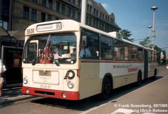 Zurück in die Vergangenheit! An einem sonnigen Augusttag im Jahre 1989 konnte Frank Rosenberg den Wagen 5639 der Krefelder Verkehrs-AG (KREVAG) - die heutige SWK Mobil GmbH - am Krefelder Hauptbahnhof aufnehmen. Es handelt sich bei dem Fahrzeug in der klassischen elfenbein-roten Farbgebung um einen MAN SG 220 im Einsatz auf der Linie 055, die damals noch die Krefelder Innenstadt bediente. Auf dem Bild trägt er Werbung für ein Krefelder Möbelhaus. Weitere alte Aufnahmen von Frank Rosenberg sind in der entsprechenden Oldie-Abteilung des Krefeld-Specials hinzugefügt worden.