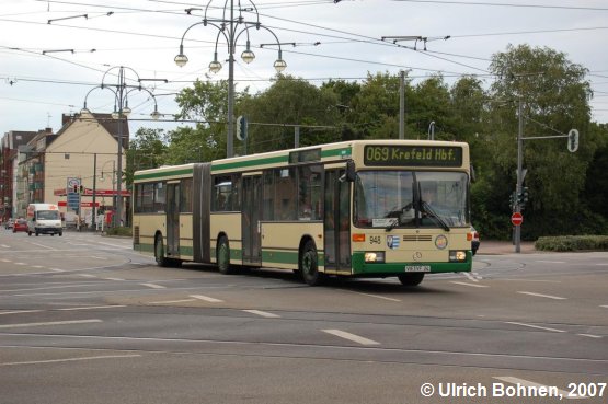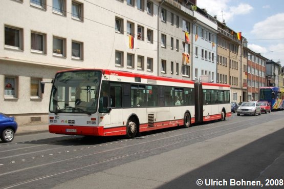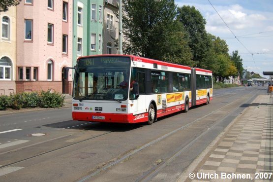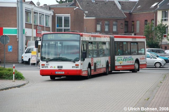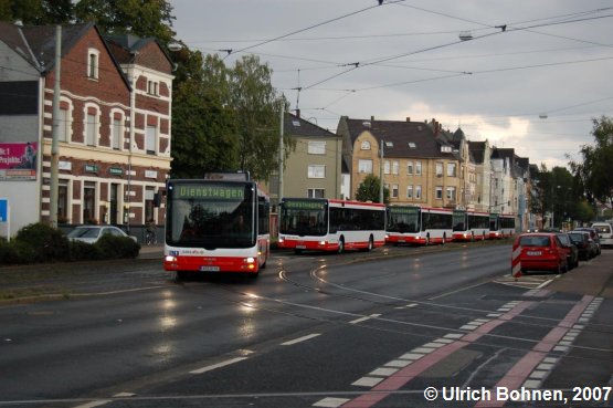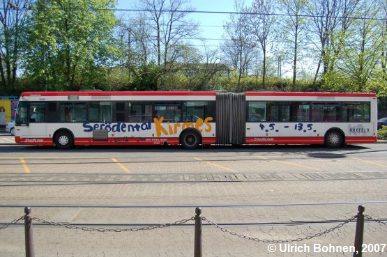 Im Juli wurde auf der Straßenbahnlinie 041 zweimal jeweils ganztägig ein Schienenersatzverkehr mit Bussen durchgeführt. Am 01.07.2007 war ein Umzug zum Schützen- und Heimatfest in Fischeln der Anlass; am 21.07.2007 fanden in Krefeld drei Demonstrationen statt, bei denen die Innenstadt großräumig abgesperrt wurde. Am 21.07. wurde sogar ein Van Hool AG 300, Wagen 5661, im Ersatzverkehr eingesetzt, was nicht so häufig vorkommt. Das Bild entstand in Höhe der Haltestelle Obergplatz in der Nähe des SWK-Betriebshofes (> Fotoserien).