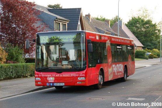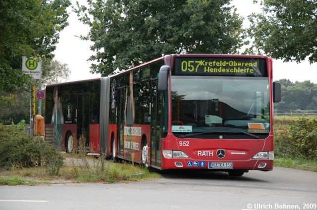 Seit dem Fahrplanwechsel im Juni 2009 wird die Linie 057 auch sonn- und feiertags planmäßig mit Gelenkbussen bedient. Daher kann man nun Rath-Gelenkbusse nicht nur montags-freitags im Einsatz antreffen. Am 06.09.2009 wurde der 2008 in Dienst gestellte Mercedes-Gelenkbus mit dem Kennzeichen VIE-EA 150 an der Haltestelle Oberend Wendeschleife in Krefeld-Oppum fotografiert.
