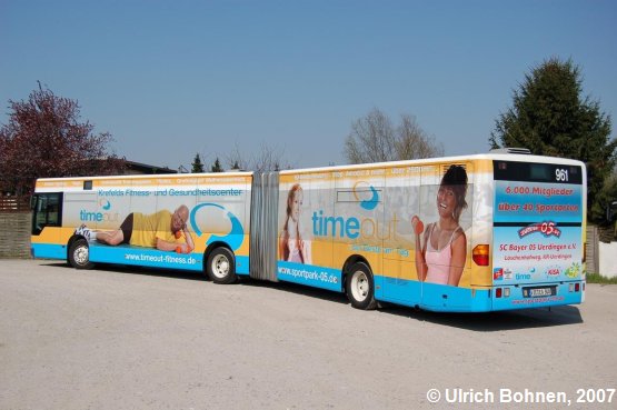 Sehr wahrscheinlich im kommenden Herbst werden sich die vier 1996 gebauten EvoBus-Mercedes O 405 NK von Rath aus Viersen aus dem Linienverkehr zurückziehen und durch Citaro-Busse vom selben Hersteller ersetzt werden. Am Nachmittag des 22.07.2006 konnte einer der nur ca. 10 Meter langen O 405 NK im Europark Fichtenhain, einem Gewerbegebiet im Süden Krefelds, aufgenommen werden. Es handelt sich um das einzige Fahrzeug mit der "roten" Version der Real-Werbung (SWK-Funknummer 957), das hier auf der Linie 047 unterwegs ist.