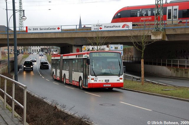 Das Schulzentrum Horkesgath im Westen Krefelds wird regulär nur durch die SWK-Linie 061 bedient; morgens und mittags jedoch verkehren zusätzliche Einsatzwagen in die Innenstadt und in den Ortsteil Hüls. Bei der SWK werden E-Wagenfahrten zusätzlich mit der Linien-Nr. angezeigt, deren Linienweg regulär befahren wird. Wenn man allerdings ganz genau ist, befindet sich der SWK-Wagen 5664, ein Van Hool AG 300, noch nicht auf dem Linienweg der 057, als er am 28.11.2006 mittags das Schulzentrum Horkesgath verlässt.