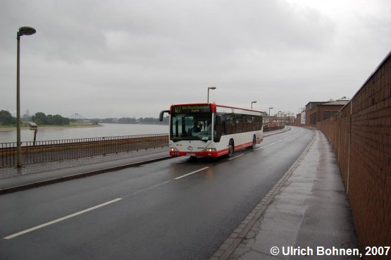 Im ihrem Verlauf führt die SWK-Linie 927, die zwischen Krefeld Hbf. und dem Markt in Duisburg-Rheinhausen verkehrt, auch direkt am Rheinufer vorbei. Passenderweise heißt diese Straße in Krefeld-Uerdingen auch Rheinuferstraße, auf der sich am regnerischen 28.05.2007 der SWK-Wagen 5441, ein 2005 gebauter EvoBus-Mercedes O 530 (Citaro), präsentiert. Bei der Frontaufnahme liegt rechts das Gelände der Bayer-Werke; hinten links ist die Uerdinger Rheinbrücke zu erkennen.